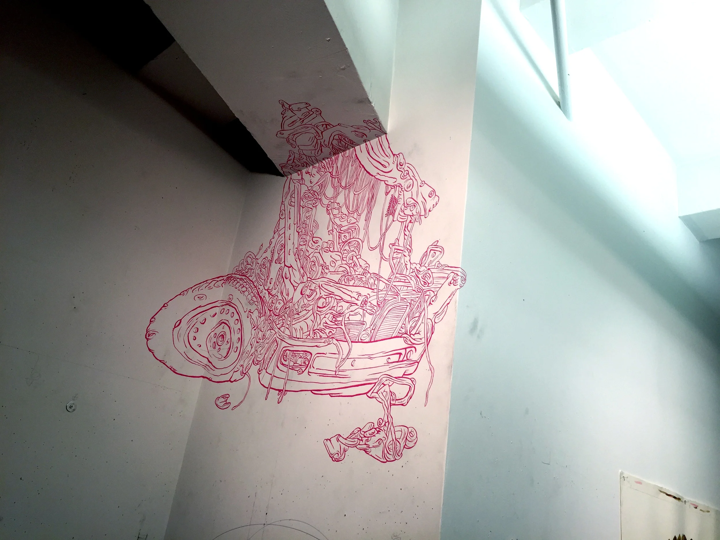 This 16 sq. ft. indoor drawing in acrylic paint applied on my studio wall (4 surfaces) with a brush is a test for a series of wall drawings that I intend to install this fall.