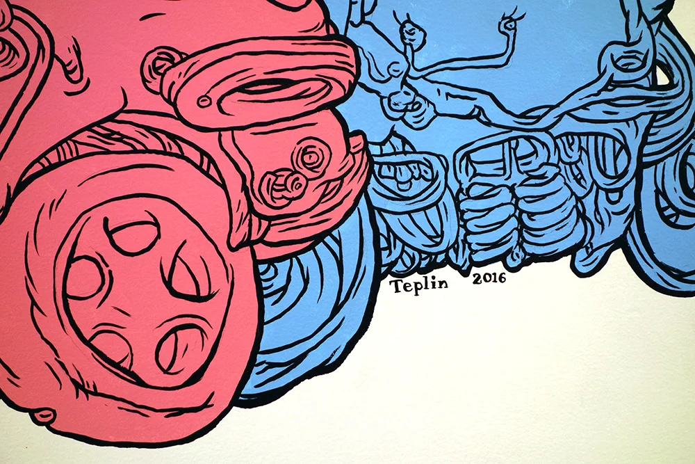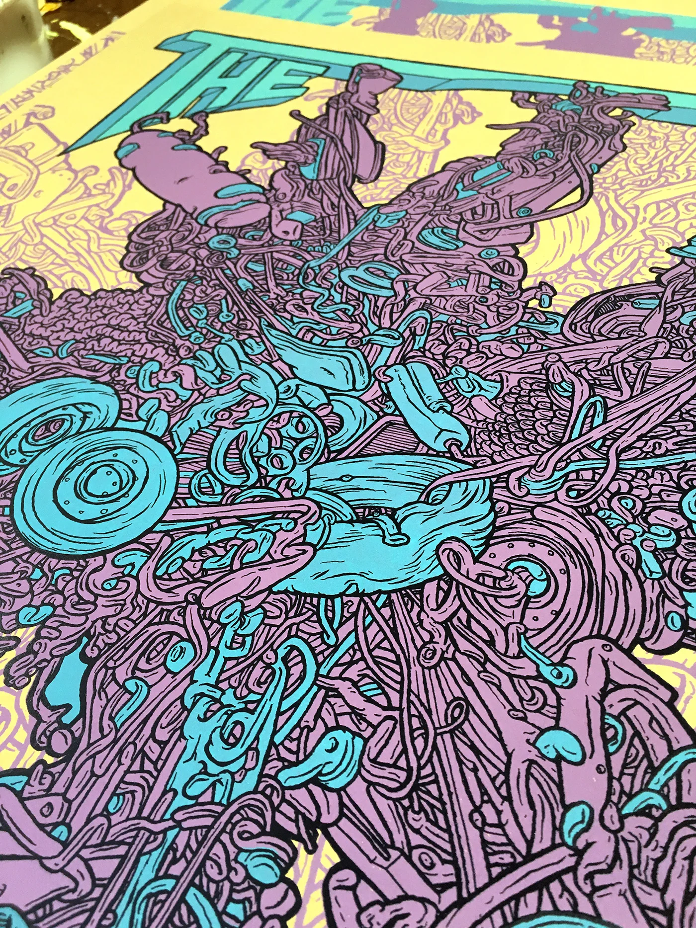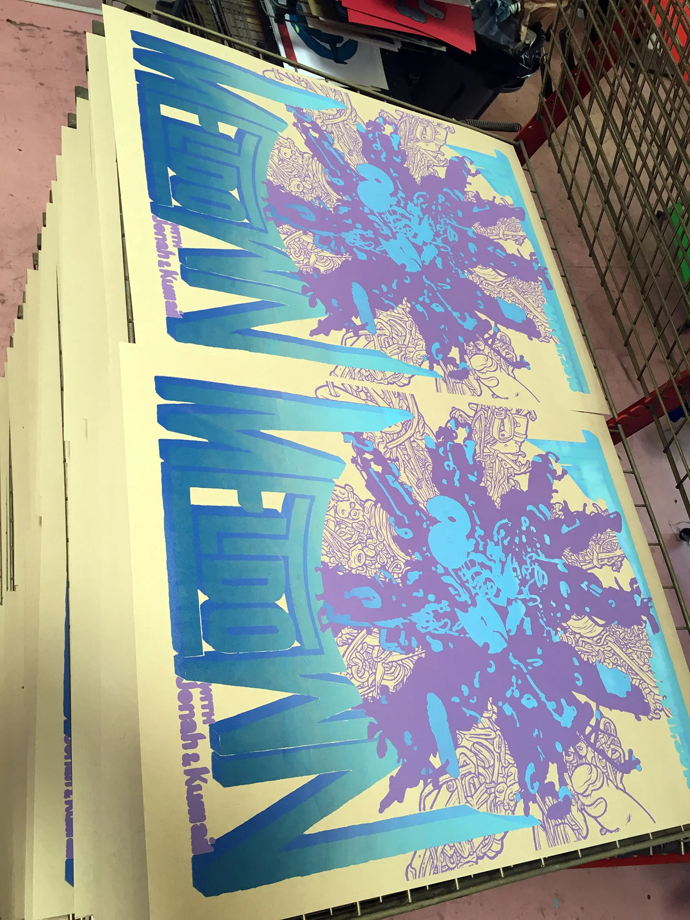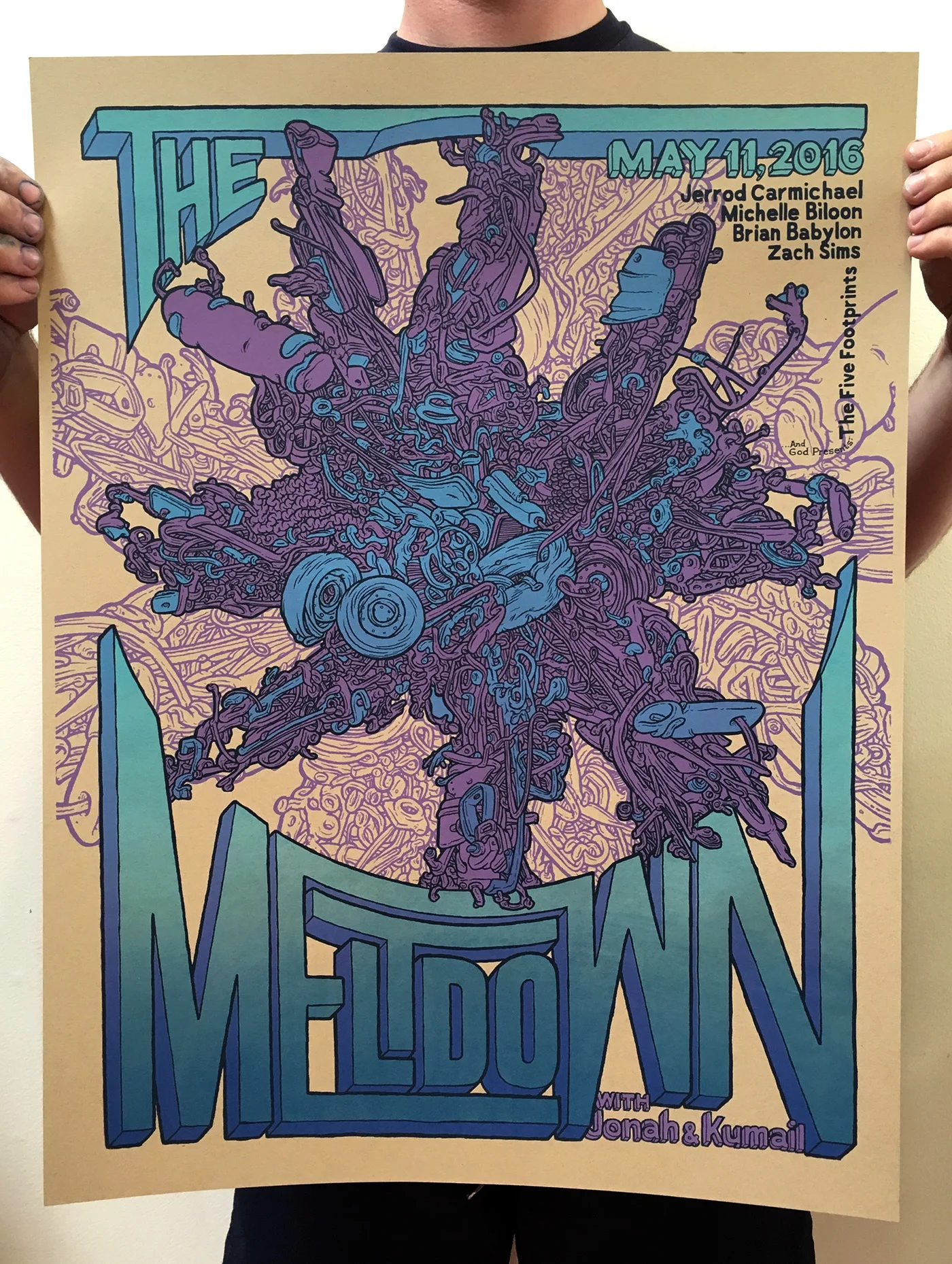 I was invited by master Meltdown illustrator and printer Dave Kloc to draw tonight's Meltdown with Jonah and Kumail poster (printed by Dave). Here's how it evolved into a 24" x 18" 4 color silkscreen (only 50 were printed!)