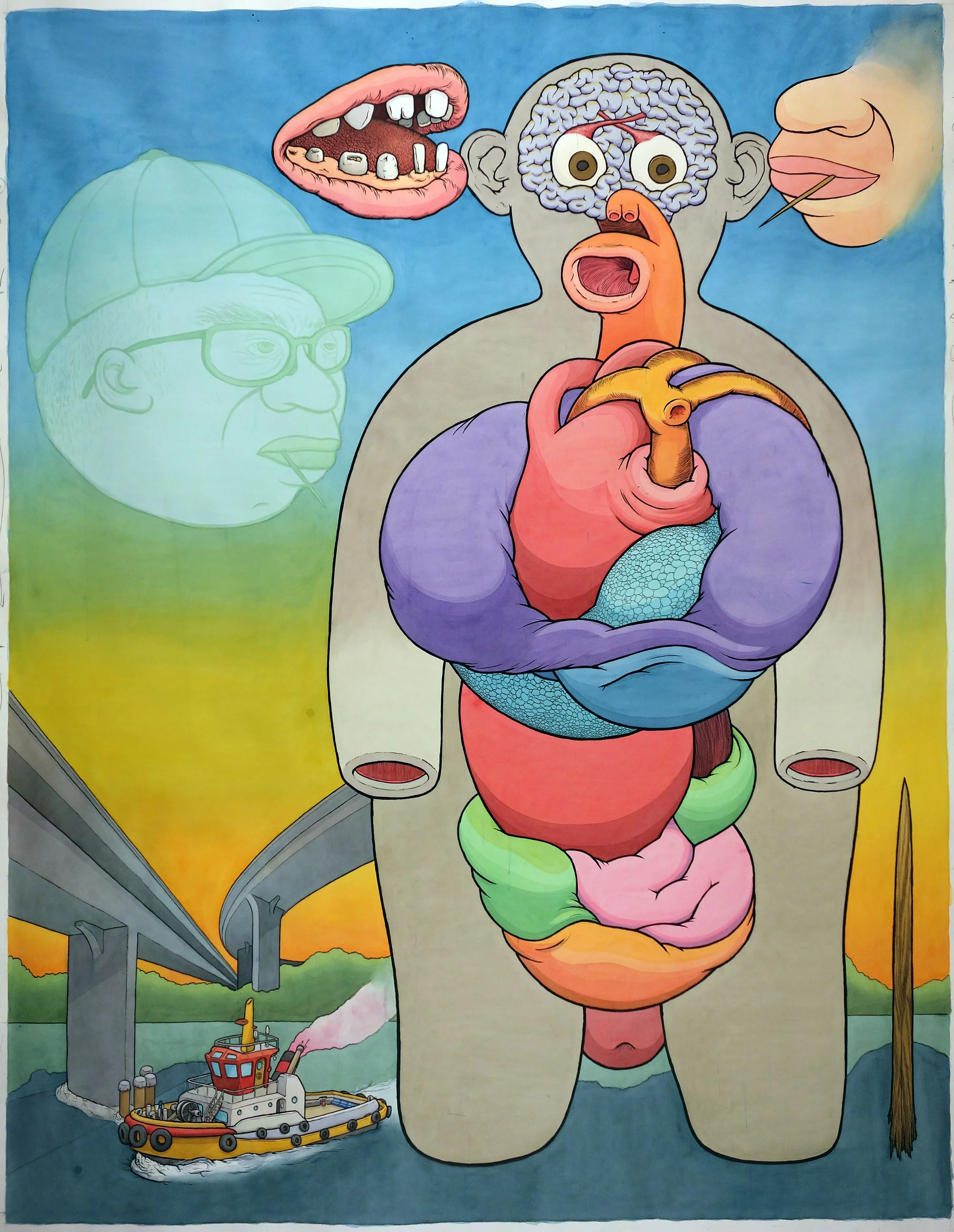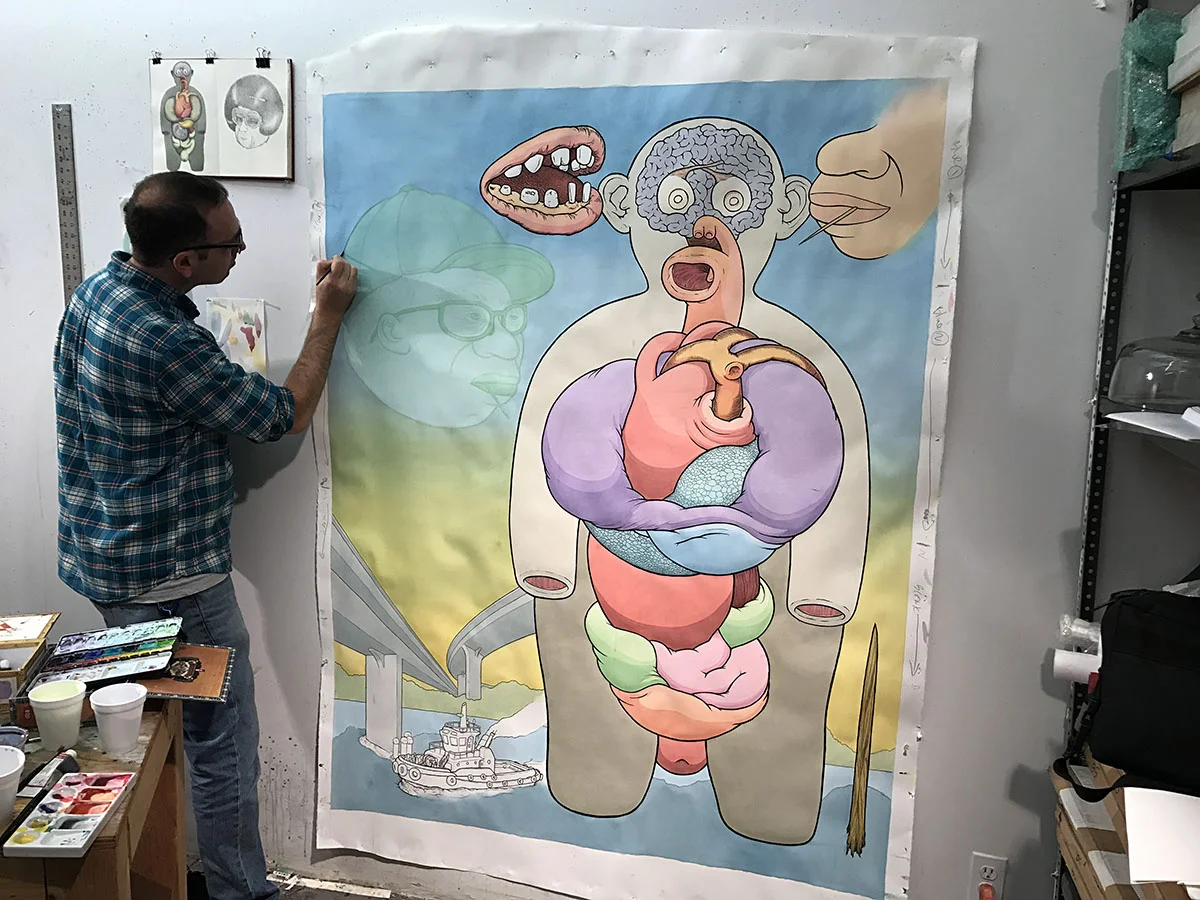 Tug and Hug is done completed Feb 8 Written By scott teplin Tug 'n Hug, 2017. Pen & ink and watercolor on paper. 6 ft. x 4 ft. to show scale of drawing^ pen & inkwatercolorportrait scott teplin http://www.teplin.com